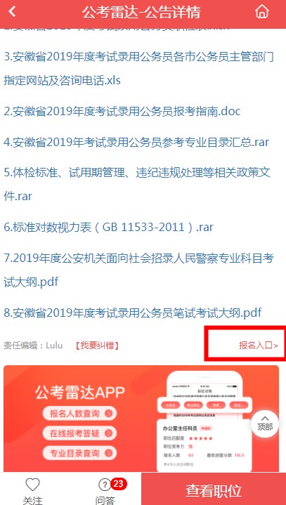 特别提醒: 下载2020年山东公务员考试报名神器:公考雷达APP,点击关注2020年山东公务员考试公告,即可快速获取2020年山东公务员考试报名绿色通道入口,具体方式如下(以2019年安徽公务员考试为例):